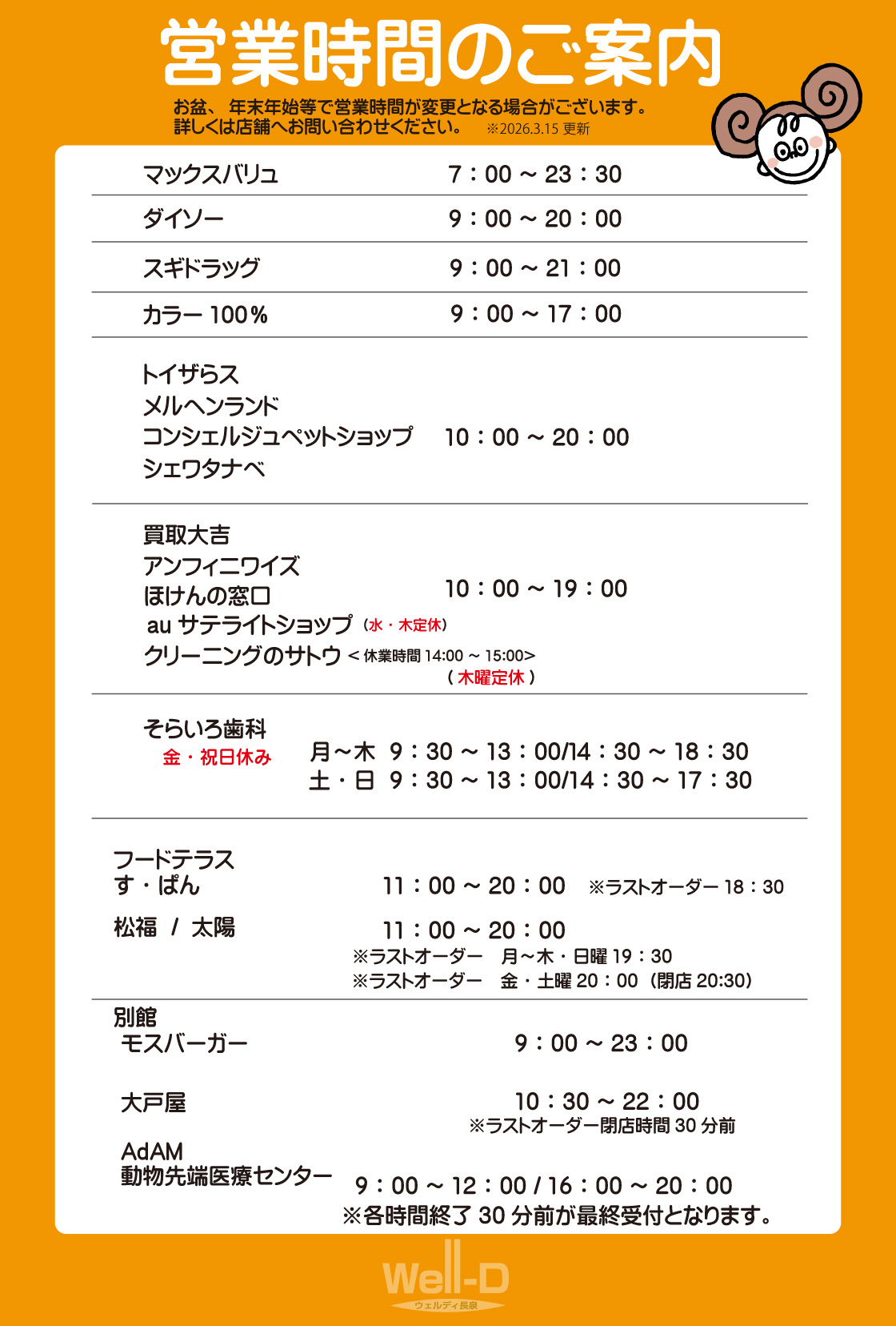 ウェルディ長泉各店舗の営業時間をお知らせいたします。
